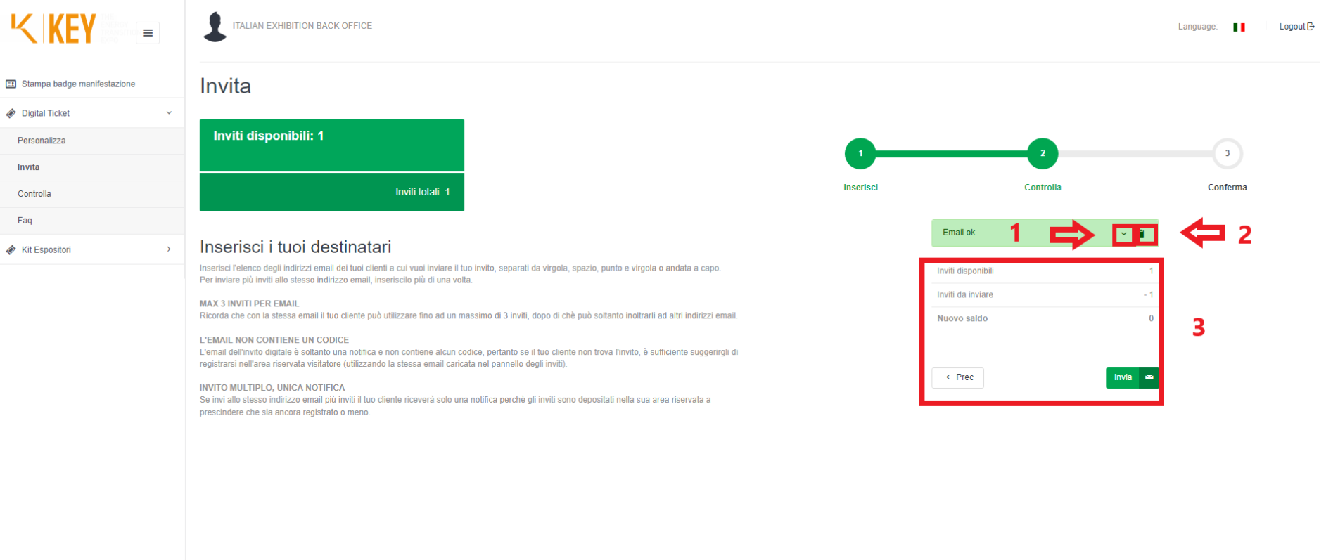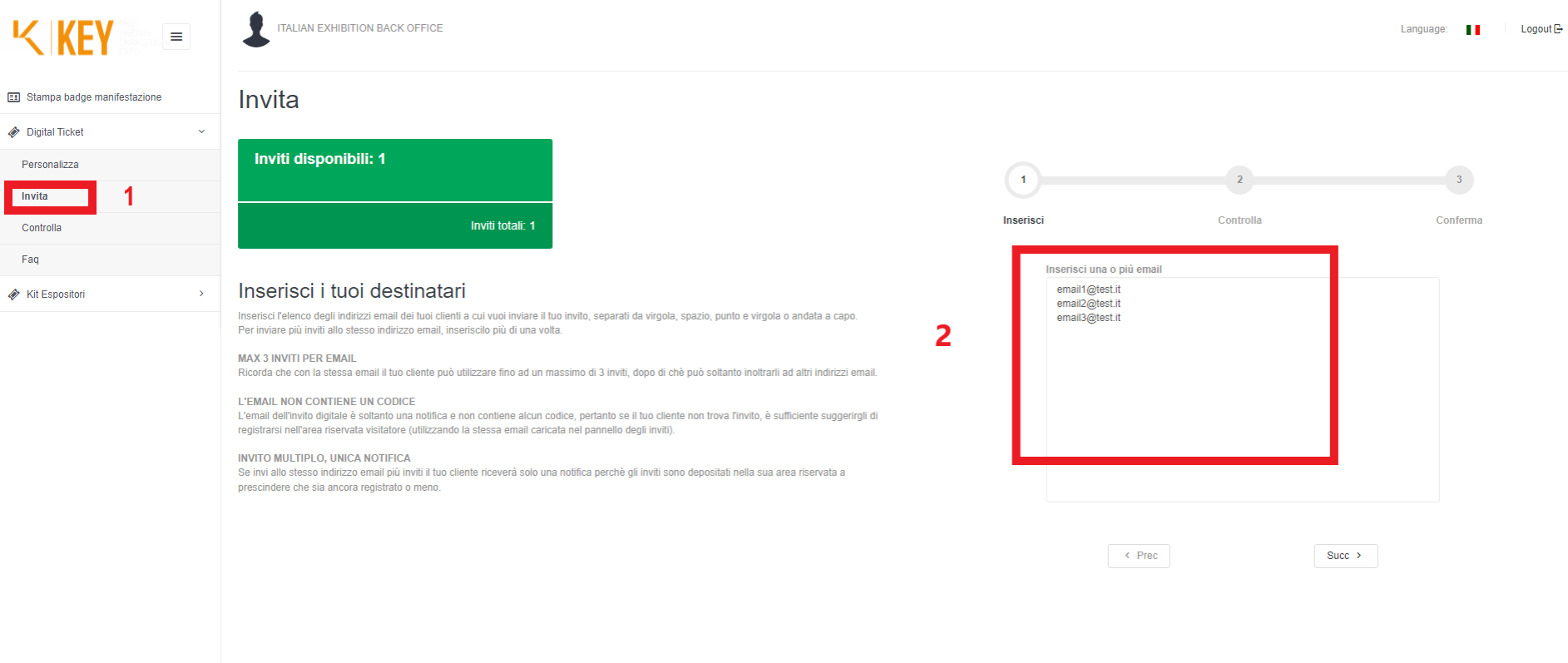 Dopo aver eseguito il login all’interno dell’area riservata con le credenziali ricevute via e-mail seleziona dal menu a sinistra “Digital Ticket” - “Invita” (vedi riquadro 1 in figura) inserisci gli indirizzi e-mail a cui vuoi mandare gli inviti (vedi riquadro 2 in figura):