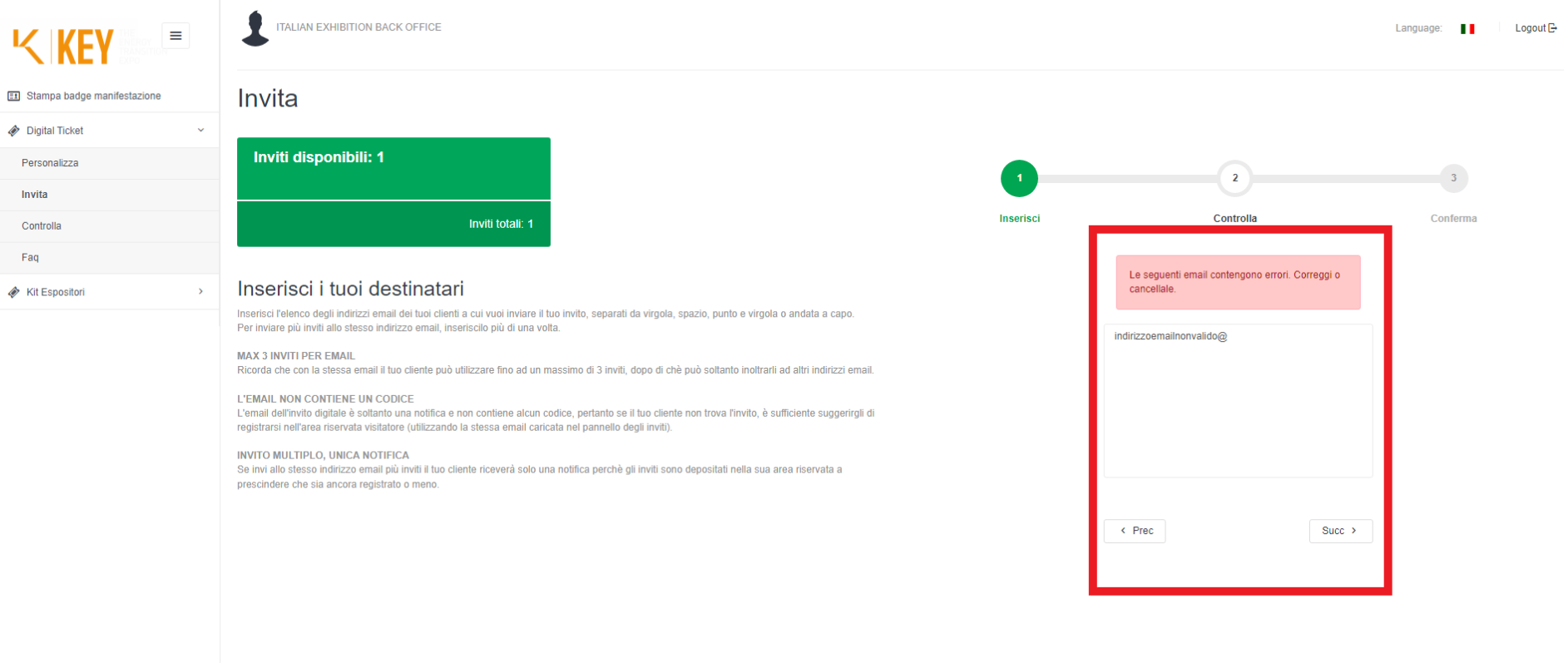 Gli invii che falliscono (dovuti a errori nell’indirizzo o server di destinazione) saranno nuovamente a tua disposizione. Alla stessa persona puoi mandare nuovamente l'invito. Il destinatario riceve un’unica e-mail di notifica e troverà gli inviti nella sua area riservata, tutti elencati come “Biglietto offerto da…” tua ragione sociale.