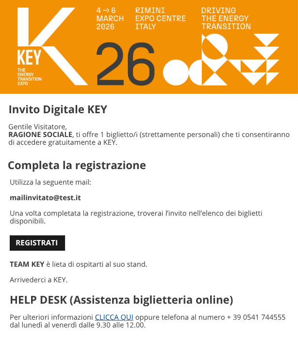 Se il visitatore non riceve l'e-mail iniziale da websupport@iegexpo.it (può purtroppo andare nello spam), ma l’invito risulta tra i consegnati, il visitatore potrà comunque vederlo nella propria area riservata registrandosi a questo link, utilizzando l'indirizzo e-mail a cui l’invito è stato spedito.